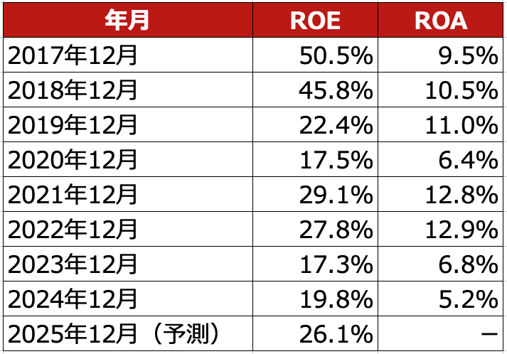 ここでいう「経営的指標」とは、市場や投資家が注目している経営に関する指標を指している。特に、企業が株主からの出資金や自己資本を元手に、どれだけ効率的に利益を生んでいるかを示す「ROE(Return On Equity(自己資本利益率))」や、企業が保有する総資産をどれだけ効率的に活用して利益を生んでいるかを示す「ROA(Return On Assets(総資産利益率))」に注目していきたい。