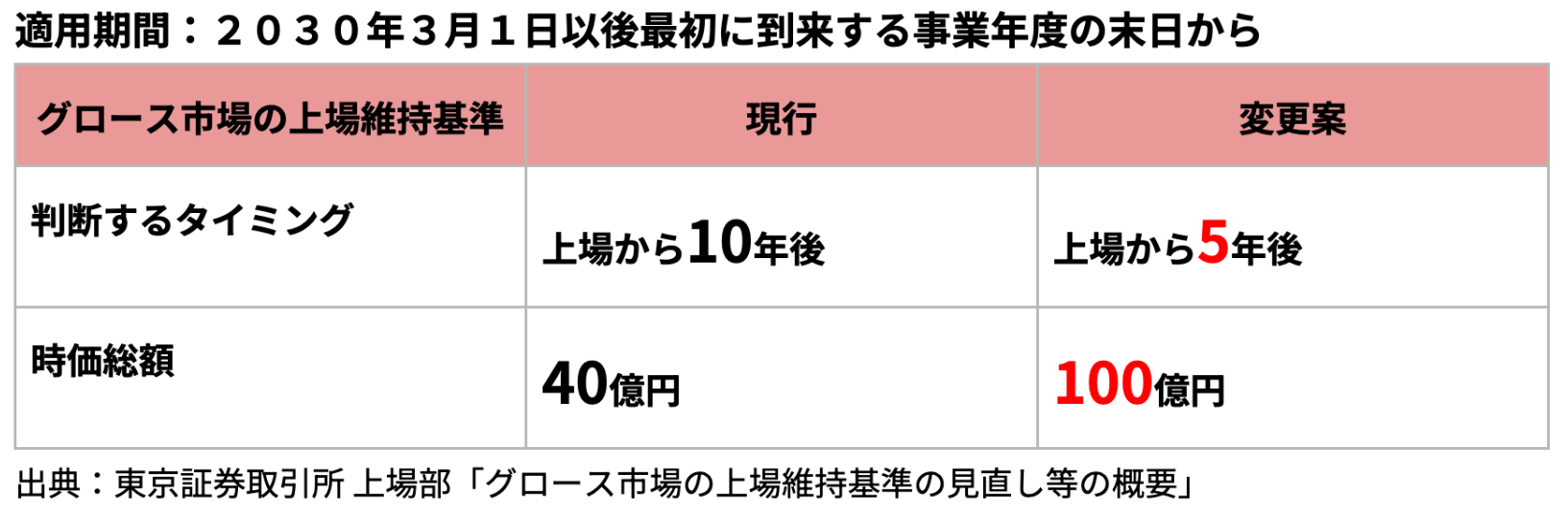 現在の日本市場において、企業価値向上の重要性がこれまで以上に重視されており、東京証券取引所は「グロース市場の上場維持基準の⾒直し等の概要」にて、2030年3⽉1⽇以後における上場維持基準を、現行の「上場10年経過後 時価総額40億円以上」から、「上場5年経過後 時価総額100億円以上」へと変更する案を提示している(図表①)。