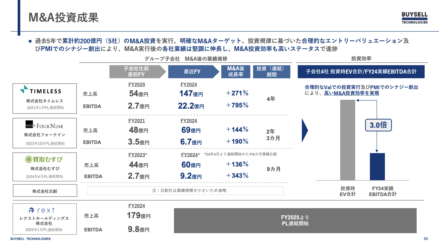 図表⑤には、時価総額推移にM&Aによって参入したグループ会社をプロットしている。2020年から2024年の5年間で5社をグループに迎え入れてきた。いずれの会社も中古品の取り扱いを営む、いわゆる同業の会社であり、つまりは「縦・横のM&A」に則したM&Aであった。同社はそれらの会社を上述した「独自性」によって業績を向上させてきた(図表⑧)。