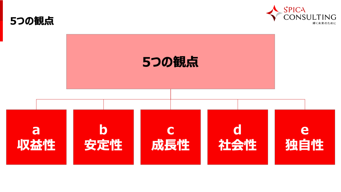 戦略と同様に、その会社が営むビジネス(モデル)も多岐にわたる。全く違うビジネスモデル同士を比較するのは難しいので、次の5つの観点でビジネス面の評価をすることとした(図表③)。