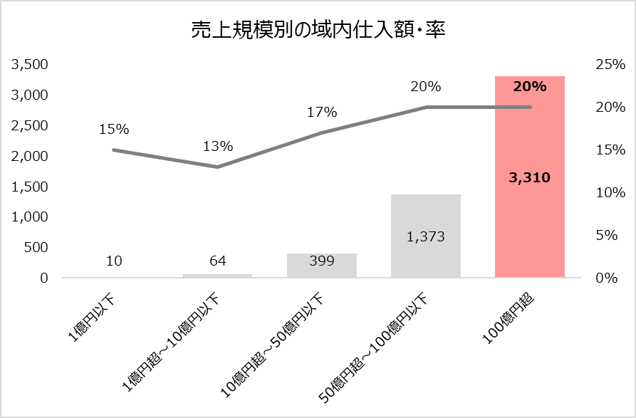売上規模と域内仕入の関係にも興味深い関係性がある。図表③は、売上規模別に域内仕入における額と率を示している(域内仕入率=売上高に占める域内仕入額の割合)。売上規模が100億円越えまでに成長した企業は、近隣・周辺地域からの仕入金額・仕入比率が大きく、域内需要の創出を牽引していることが分かる。