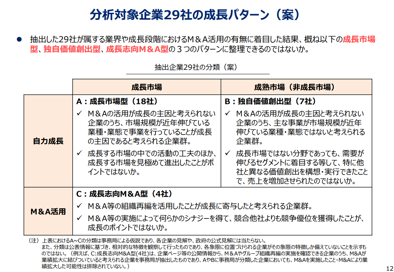 図表⑤は、売上高1-10億円企業が100億円越まで成長した企業群において、中小企業庁が共通項を整理した資料である。この資料によると、大きく売上高を伸ばした企業の成長パターンは、A:成長市場型・B:独自価値創出型・C:成長志向M&A型、の3種類に区分されている。