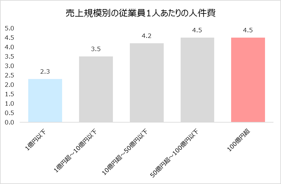 また企業の売上高と賃金にも興味深い関係性がある。中小企業庁のデータによると、売上規模が大きくなるほど従業員1人あたりに割く人件費の金額が大きくなることが分かっている(図表②)。図表②のグラフ内で見ると、売上高1億円以下の企業と100億超の企業では、1人あたりの人件費が倍近く、金額でいえば200万円もの差が生じている。