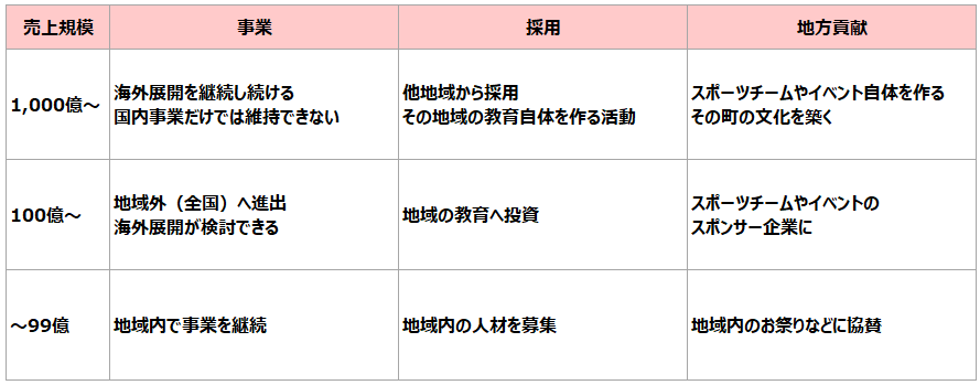 このように売上規模が大きな会社は、事業・採用・地方貢献に共通していずれも「長期的な目線での投資活動」が行えるようになる。地方創生という大きな問題に対して企業が強い影響を与えるためには、短期的な目線だけでなく、長期的な目線を取り入れた企業活動をしていくことが必要不可欠ではないだろうか。