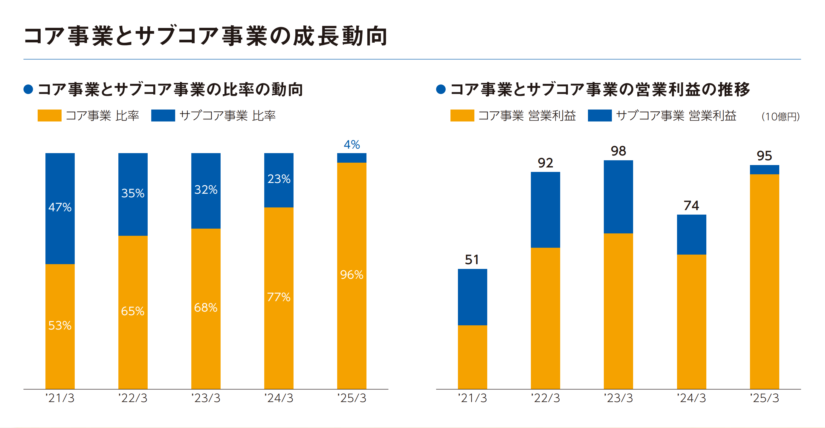 ミネベアミツミは、「コア/サブコア/非コア」という事業区分を設け、経営資源を配分すべき領域を明確にしています。具体的には、「八本槍(ベアリング、アナログ半導体など8事業)」というコア製品軸を定め、リソースの集中を図っています。