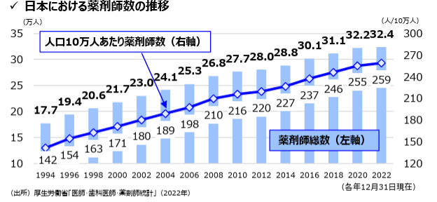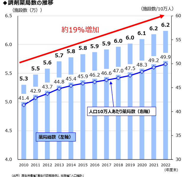 日本の人口減少が進行し続けている環境の中で、これだけ薬剤師が増加し続けているのは適正なのかどうかというのは、今後も議論が深まっていくことと思います。加えて、薬剤師の増加とともに調剤薬局の施設数も増加しており、小規模な企業が乱立していることが業界の非効率性を象徴していると指摘されています。