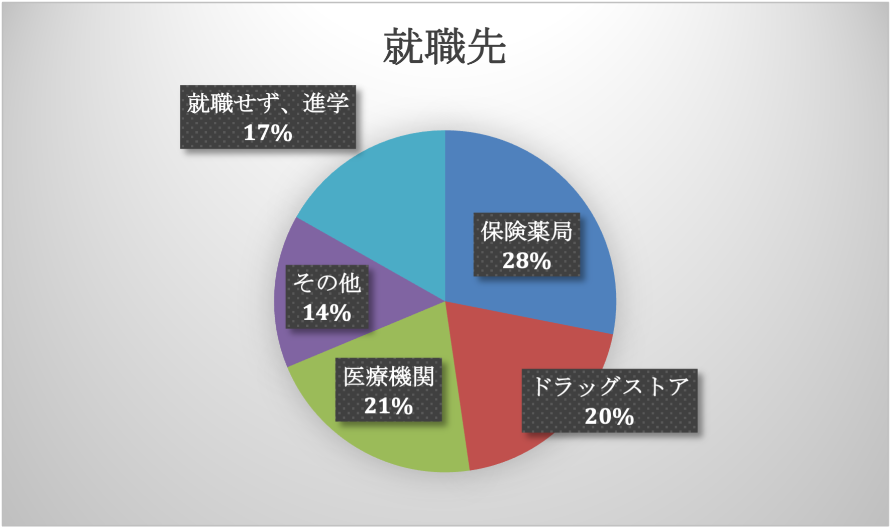 就職しない学生(17%)を除くと薬学部の進路の多くは、保険薬局とドラッグストアの調剤部門に就職しているということが分かります。