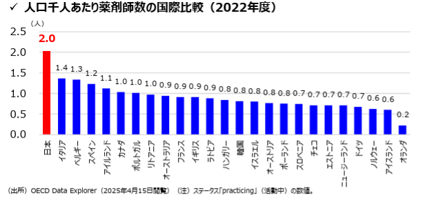 前テーマに記載している薬剤師の数についても、日本の薬剤師数が増加し続けている点が先進国との国際比較においても際立っていることが指摘されています。