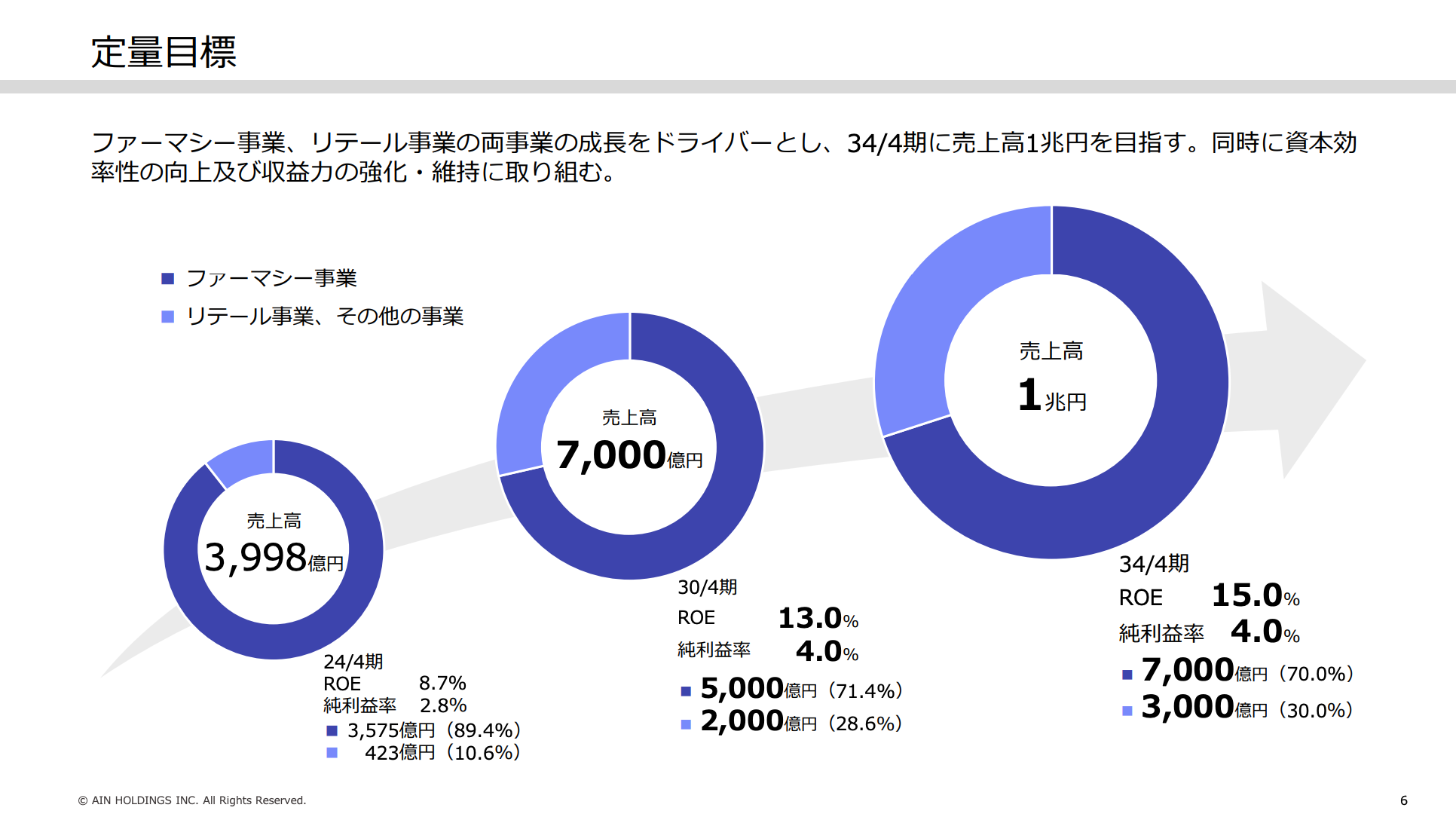 そうした業界環境下でアインホールディングスは、リテール事業を第2の主力事業として注力しており、2034年4月期には30%の全体売上構成比(2025年4月期は13%)とする計画されています。